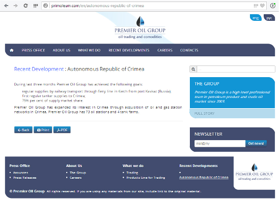 Агентство РБК обнаружил сайт Premier Oil Group, где утверждается, что она обеспечивает 75% поставок нефтепродуктов в Крым, владеет 73 АЗС и четырьмя нефтебазами на полуострове, сотрудничает с «Роснефтью», ЛУКОЙЛом, а также с крупнейшими мировыми трейдерами, вроде Vitol. Следы Premier Oil Group ведут к бежавшему из Украины бизнесмену Сергею Курченко.