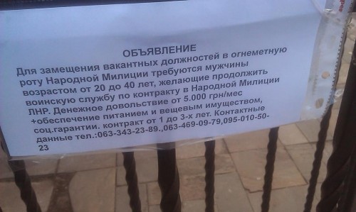 В сети сегодня появилось фото объявления, в котором приглашаются люди на вакантные должности в роту огнеметчиков так называемой «народной милиции» ЛНР.