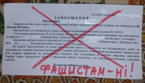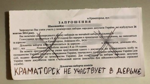Сегодня в интернете было выложено несколько фото, на которых небольшая часть жителей Краматорска категорически отзывается об украинской власти. Бюллетени после агрессивных надписей на них становятся недействительными. Фото жители города выкладывают на пророссийских ресурсах и группах в социальных сетях.