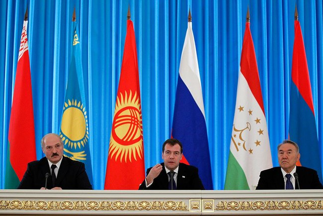 Президенты Беларуси, России и Казахстана Александр Лукашенко, Владимир Путин и Нурсултан Назарбаев