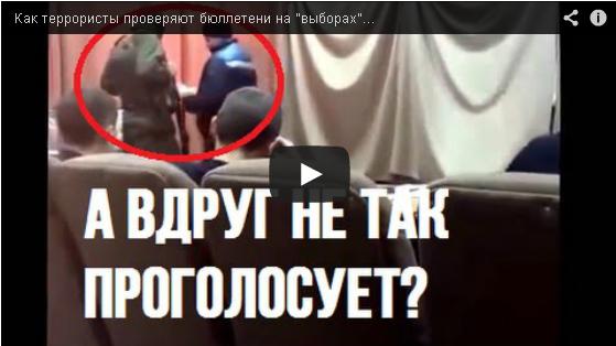 На видео зафиксировано, как человек в балаклаве и в бронежилете заглядывает в бюллетень перед тем, как проголосовавшие опустят его в урну для голосования. Вероятно, в так называемой ДНР не слышали о тайне голосования.