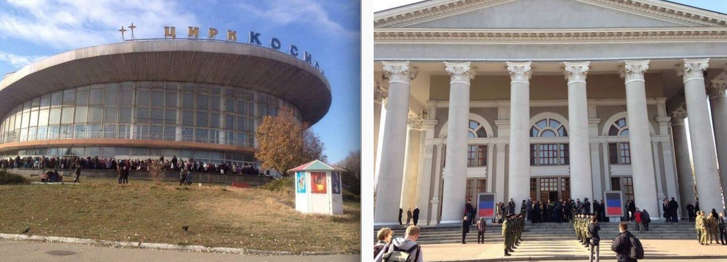 Справедливость по-донецки: одни стоят в очереди за 100 граммами каши, другие устроили в театре банкет в честь Захарченко прямо сейчас.