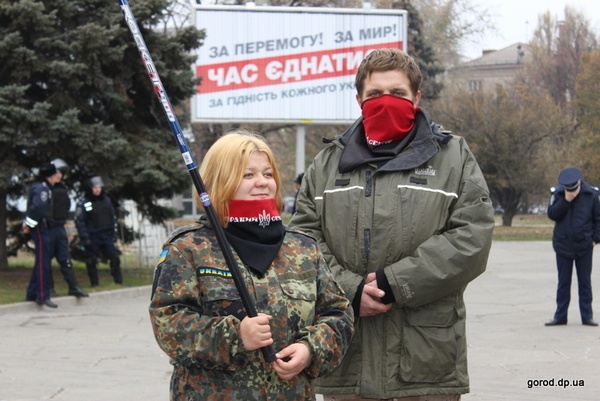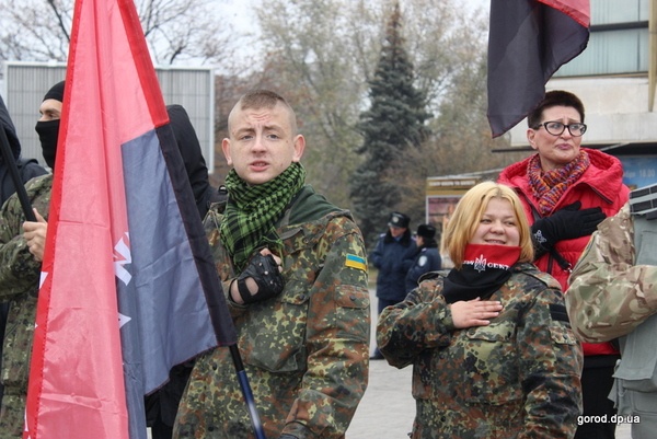 "Я ехала с работы в первом трамвае, увидела митинг и решила поддержать молодых ребят, которые защищают Украину. Это наши дети и внуки, которые знают, что это наша земля и они правы, - рассказывает примкнувшая к "правым" пенсионерка Нина Федоровна. – Как можно хорошо относиться к комунистам, когда во время организованного ими голодомора в 33-ем у меня умерли четыре брата?"