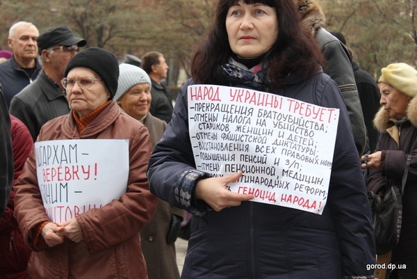 Так и митиннговали по разные стороны милицейсого заслона. У одних звучала "Катюша", другие пели гимн Украины. Одни кричали, что требуют повышения пенсий и снижения пенсионного возраста, другие славили Украину и напоминали опонентам о Голодоморе. Примечательно, что пожилые люди были по обе стороны и каждый из них пытался донести свою "правду" оппонентам.