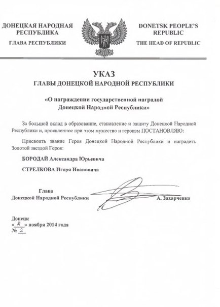 Соответствующий "указ №2" головы "ДНР" Александра Захарченко был опубликован на сайте организации. Согласно с ним, Гиркину должны вручить награду - "золотую звезду".