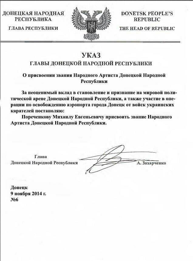 Сегодня так называемый глава Донецкой Народной Республики подписал указ о присвоении Пореченкову звания народного артиста несуществующего государства.