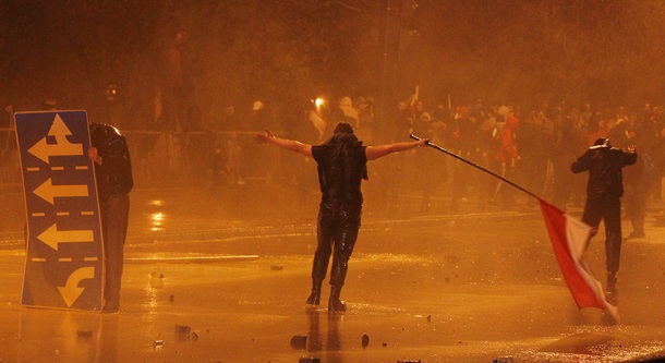 Полиция приблизилась к участникам беспорядков, большинство из которых скрывали свои лица под балаклавами, после чего для разгона демонстрантов был использован водомет. В результате бунтари вернулись обратно на мост, и пошли в том направлении, откуда они пришли.