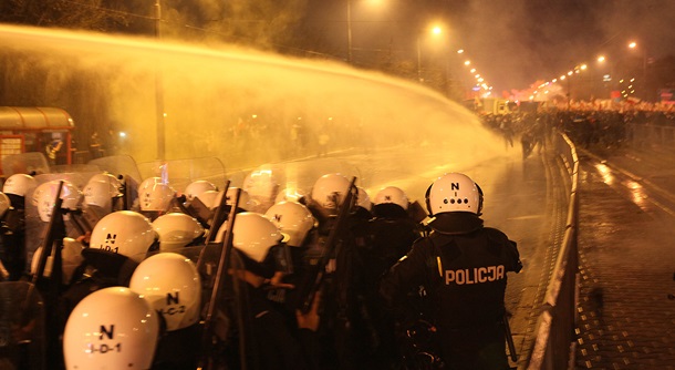 Полиция в польской столице прибегла к использованию водометов во вторник после того, как несколько сотен людей в масках, которые отсоединились от марша праворадикальных сил, начали бросать камни и пускать сигнальные ракеты в ряды полицейского спецназа, сообщает Reuters.