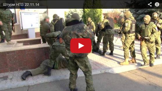 На записи видно, как несколько парней в спортивной форме битами начали разбивать стекла проходной НПЗ, вскоре к ним присоединились два десятка людей с закрытыми лицами, в камуфляже и с автоматами, а также гражданский в деловом костюме с бумагами.