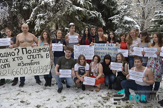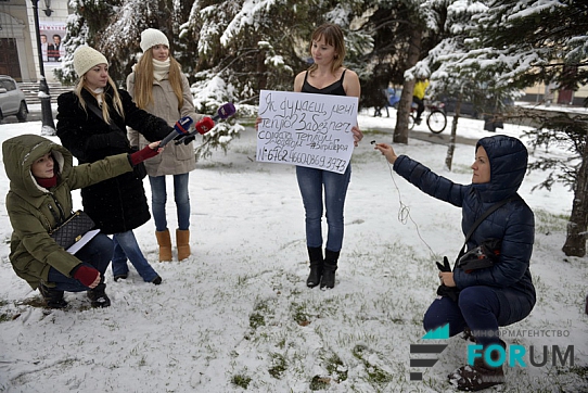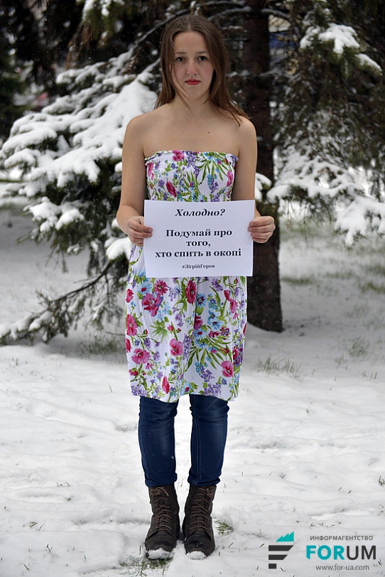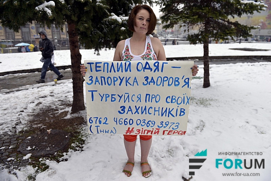 В руках активисты держат плакаты с надписями: «Как думаешь, мне тепло?», «Обеспечь солдата теплой одеждой», «Теплая одежда – залог здоровья. Беспокойся о своих защитниках».