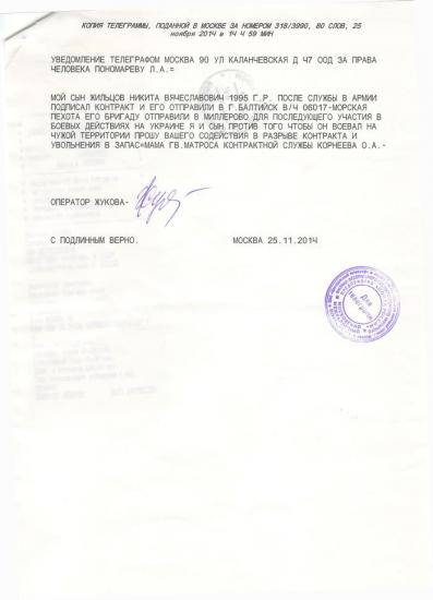 После того, как мой сын узнал, куда и при каких обстоятельствах их будут отправлять, он неоднократно заявлял, что не желает осуществлять боевые действия на территории другого государства. Он говорил это своему командиру, но его волеизъявление не принимают во внимание, рапорт о расторжении контракта ему не подписали, отказ от участия в боевых действиях он написать не может так как их нет – речь идет об учениях. До указанных событий он добросовестно выполнял свои обязанности, а после игнорирования его нежелания пересекать без документов границу с Украиной он принял решение ничего не делать, может даже совершить проступок для того, чтобы ему как нерадивому солдату подписали документы об отправке. Я понимаю, что он вместе с сослуживцами сейчас находится в безвыходной ситуации по причине того, что он не был информирован о фактическом участии его в боевых действиях. Ночью 24.11.2014г. сын с сослуживцами покинули территорию военного лагеря, купили спиртные напитки и распили их. Потом они попали в военную комендатуру, где на моего сына был составлен «протокол о грубом дисциплинарном проступке», копия которого имеется у него на руках. В комендатуре, отвечая на вопросы о причинах совершенного, он так же ответил, что не желает принимать участие в боевых действиях на территории Украины. В данном документе на решение командира в/ч 06017 гвардии полковника В. Кравцова в п. 1 указано: «отправить гвардии матроса Жильцова Н.В. в пункт постоянной дислокации»; в п. 7 указано: «подготовить документы на увольнение гвардии матроса Жильцова Н.В.». Указанный протокол командиром части не был подписан (скан-версию протокола в электронном виде прикладываю к настоящему заявлению). В части у него отобрали жетон, военный билет и банковскую карту, что бы он не убежал, хотя убегать он не хочет, он хочет расторгнуть контракт, тем более что он на испытательном сроке!