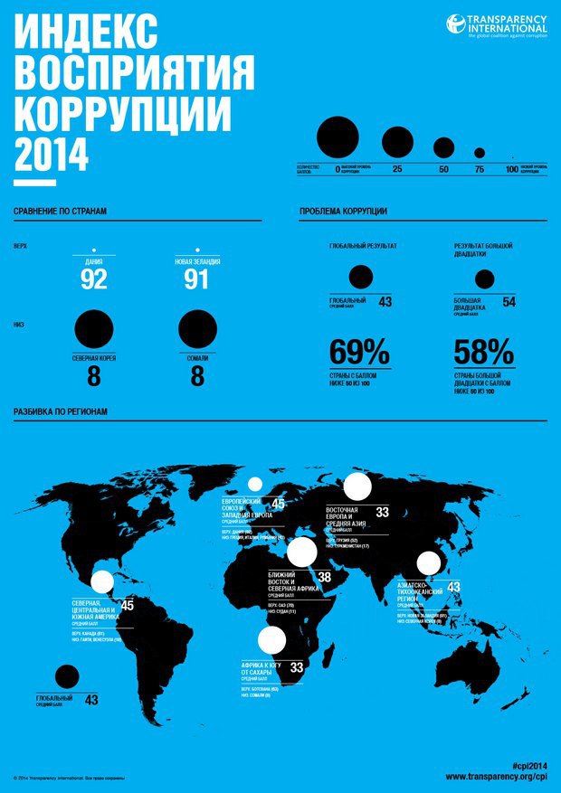 Индекс восприятия коррупции создается по результатам независимых опросов, в которых берут участие международные и правозащитные эксперты, в том числе из Всемирного банка, Freedom House, World Economic Forum, Азиатского и Африканского банков развития. Нулевой индекс свидетельствует о тотальной коррупции, индекс 100 - о ее полном отсутствии.