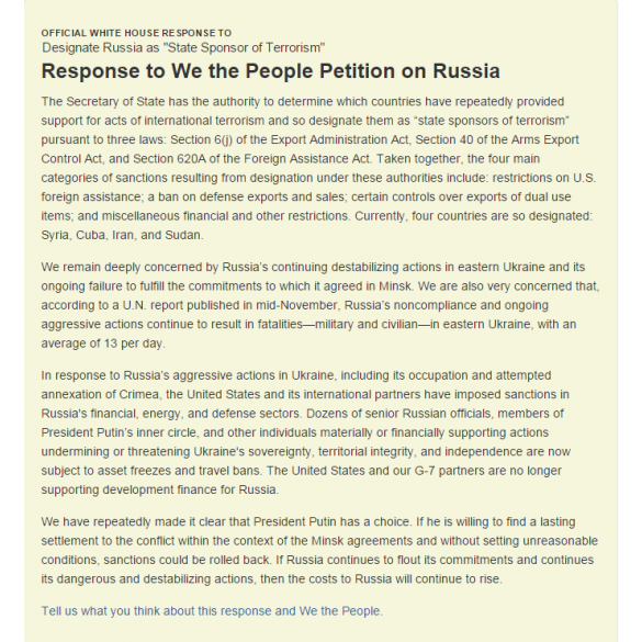 На сайте администрации президента США появился официальный ответ Белого дома на петицию за признание Российской Федерации страной, спонсирующей терроризм, которая была опубликована 23 апреля 2014 г.