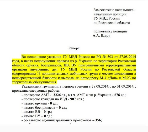 «Украинские Кибервойска» опубликовали в открытом доступе документы с сервера МВД России, который они взломали в октябре 2014 года. Первую часть документов объемом 1,78 Гб уже можно найти на файлообменниках. Среди многочисленных материалов, касающихся войны с Украиной, есть рапорт замначальника полиции Ростовской области полковника А.А.Щура, из которого понятно, что российское руководство боится возвращения отправленных в Украину боевиков с оружием. Полковник сообщает, что «в целях недопущения провоза из Украины оружия, боеприпасов» МВД создало 13 дополнительных мобильных групп в приграничных районах.