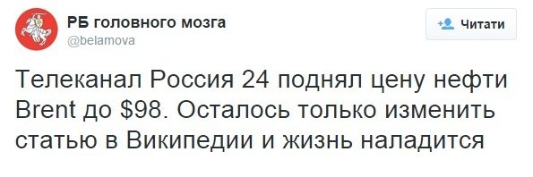 "Телеканал Россия 24 поднял цену нефти Brent до $98. Осталось только изменить статью в Википедии и жизнь наладится", - иронизирует сообщество "РБ головного мозга".