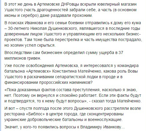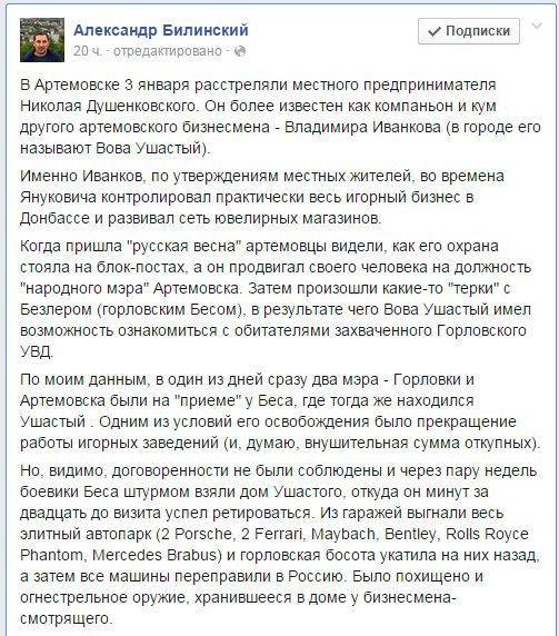 3 января в городе Артемовск был расстрелян Николай Душенковский, который владел игорным бизнесом и поддерживал террористов ДНР. Местный предприниматель сам стал жертвой боевиков. Об этом сообщает Александр Билинский на свей странице в социальной сети, пишет издание «Информатор».