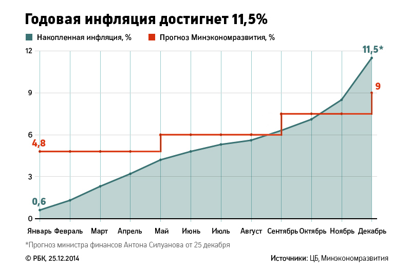 В этом году Минэкономразвития пересматривало официальный прогноз по инфляции трижды. Первоначальный прогноз к концу года был увеличен почти в два раза – с 4,8 до 9%. В реальности же, как заявил 25 декабря министр финансов Антон Силуанов, «по году, скорее всего, она будет где-то 11,5%, может быть, чуть больше».