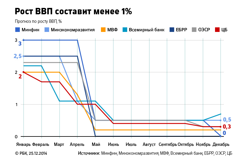 Если в начале года экономический блок правительства и банки в целом сходились во мнении, что за 12 месяцев ВВП увеличится на 2–3%, то уже весной даже минимальный рост был поставлен под сомнение. Причины сокращения ВВП — в снижении притока инвестиций в связи с ситуацией на Украине, существенное замедление роста производственных и торговых запасов и низкий внутренний спрос.