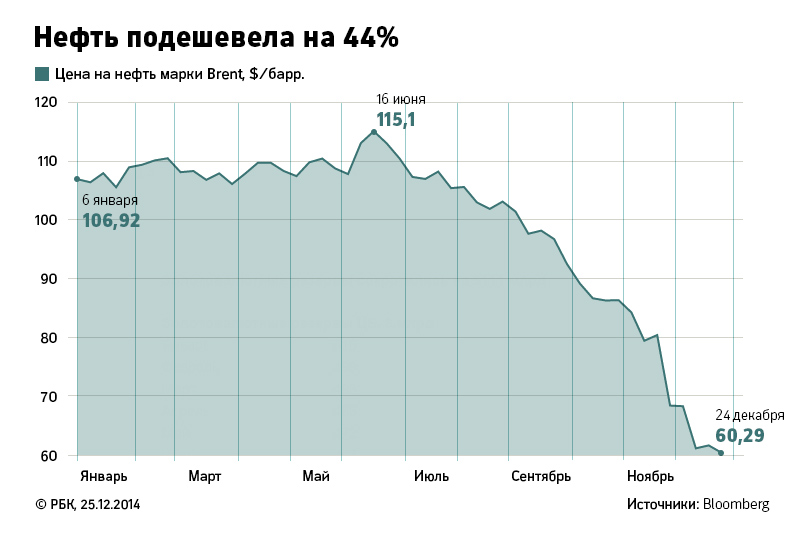 До середины 2014 года цены на нефть оставались стабильными в пределах $105-115 за баррель. В сентябре котировки пошли вниз и к декабрю упали до $60/барр. В самых пессимистических прогнозах аналитики предрекали снижение цены до$85/барр. Кроме того, бюджет России на 2015 год сверстан исходя из среднегодовой цены нефти Urals в $80/барр.
