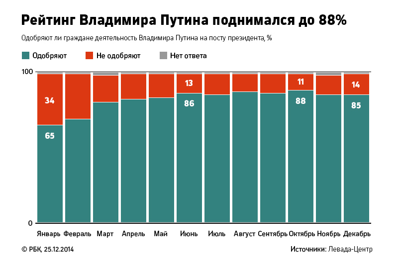 Всю первую половину года число россиян, одобряющих работу Владимира Путина на посту президента, росло. В июне рейтинг президента побил свой пятилетний рекорд. Этому предшествовали олимпийские успехи России и присоединение Крыма. Благодаря патриотическому подъему и мобилизации против «врагов» в октябре рейтинг президента взлетел на новый максимум — 88%.