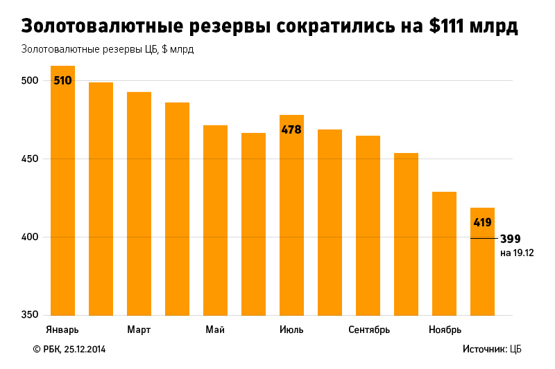 Объем золотовалютных накоплений России превысил отметку в $500 млрд в январе. Как оказалось, всего на несколько дней. В течение года Россия лишилась почти пятой части своих золотовалютных резервов и достигла по этому показателю четырехлетнего минимума. При этом тратилась в основном валюта. Причиной стало проведение ЦБ валютных интервенций, призванных поддержать рубль.