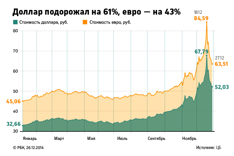 Первую половину года рубль вел себя так же стабильно, как и нефтяные цены. С середины года его курс к ведущим мировым валютам начал снижаться вместе с ценами на нефть. 10 ноября ЦБ отменил валютный коридор и отпустил рубль в свободное плавание. Неконтролируемое падение привело к тому, что 16 декабря на бирже евро стоил более 100 руб., доллар – более 80 руб.