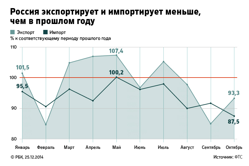 Импорт начал сокращаться втором полугодии, после введения санкций ЕС и США. Похожим образом вел себя и экспорт – его снижение замедлилось лишь на фоне обесценения рубля в последние месяцы года. Эксперты снижение импорта объясняют кризисом на Украине, санкциями и общим ухудшением инвестиционного климата, экспорта – политическими причинами и падением нефтегазовых цен.