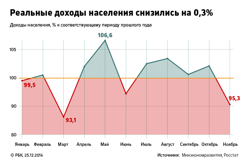 Доходы граждан на протяжении почти всего года были близки к прошлогодним значениям. Но декабрьский обвал рубля потянул изменил ситуацию. Реальные располагаемые доходы, по данным Росстата, по итогам января-ноября 2014 года снизились на 0,3%. Реальные доходы граждан продолжат снижаться и в 2015 году, как ожидается, на 5-7%, их будет обесценивать высокая инфляция.