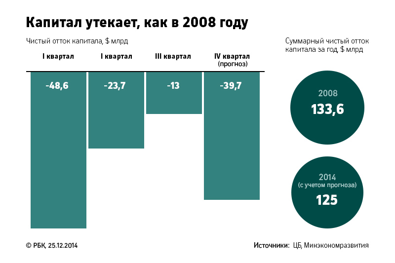 По прогнозу Минэкономразвития, отток капитала по итогам года – около $125 млрд (с учетом прогноза по 4 кварталу) – почти достигнет объемов кризисного 2008 года. Он связан с неопределенностью в экономике, переходом к плавающему курсу рубля и присоединением Крыма. Вопреки ожиданиям, санкции как таковые сказались не столь заметно – отток капитала резко возрос лишь в конце года, и главной причиной тому стало падение нефтяных цен.