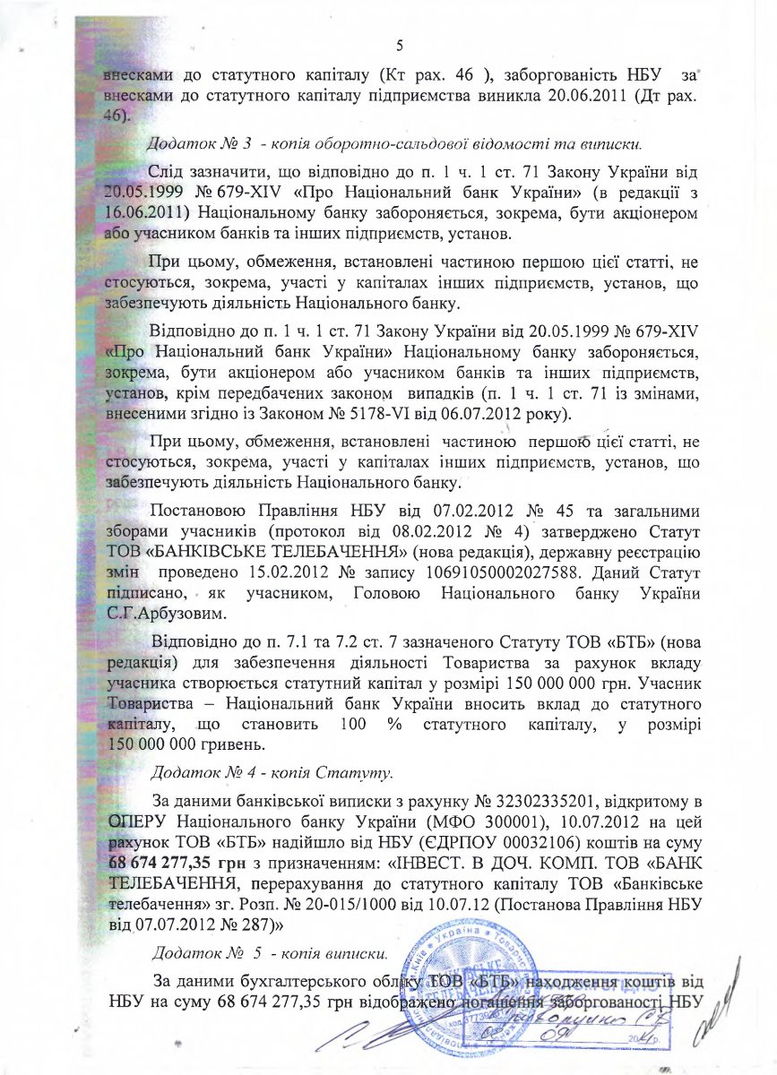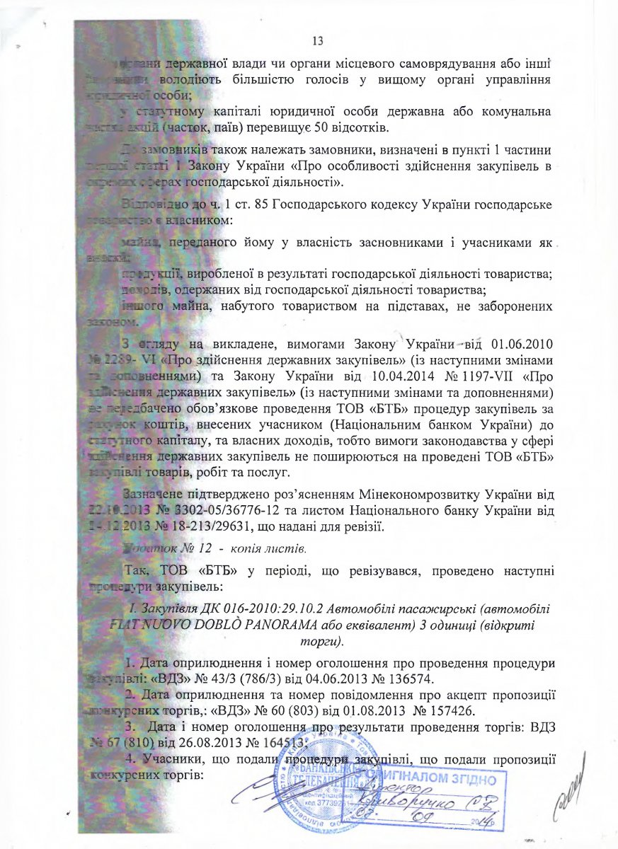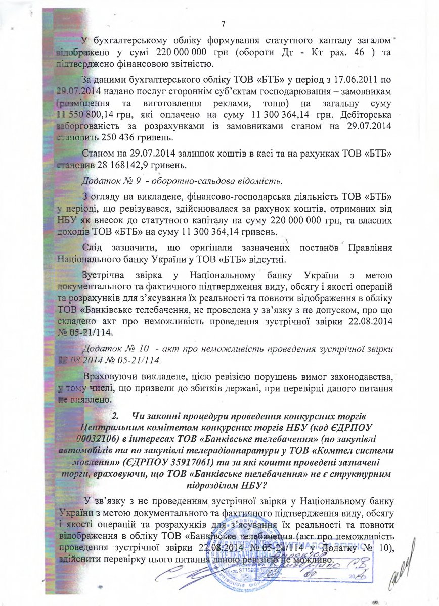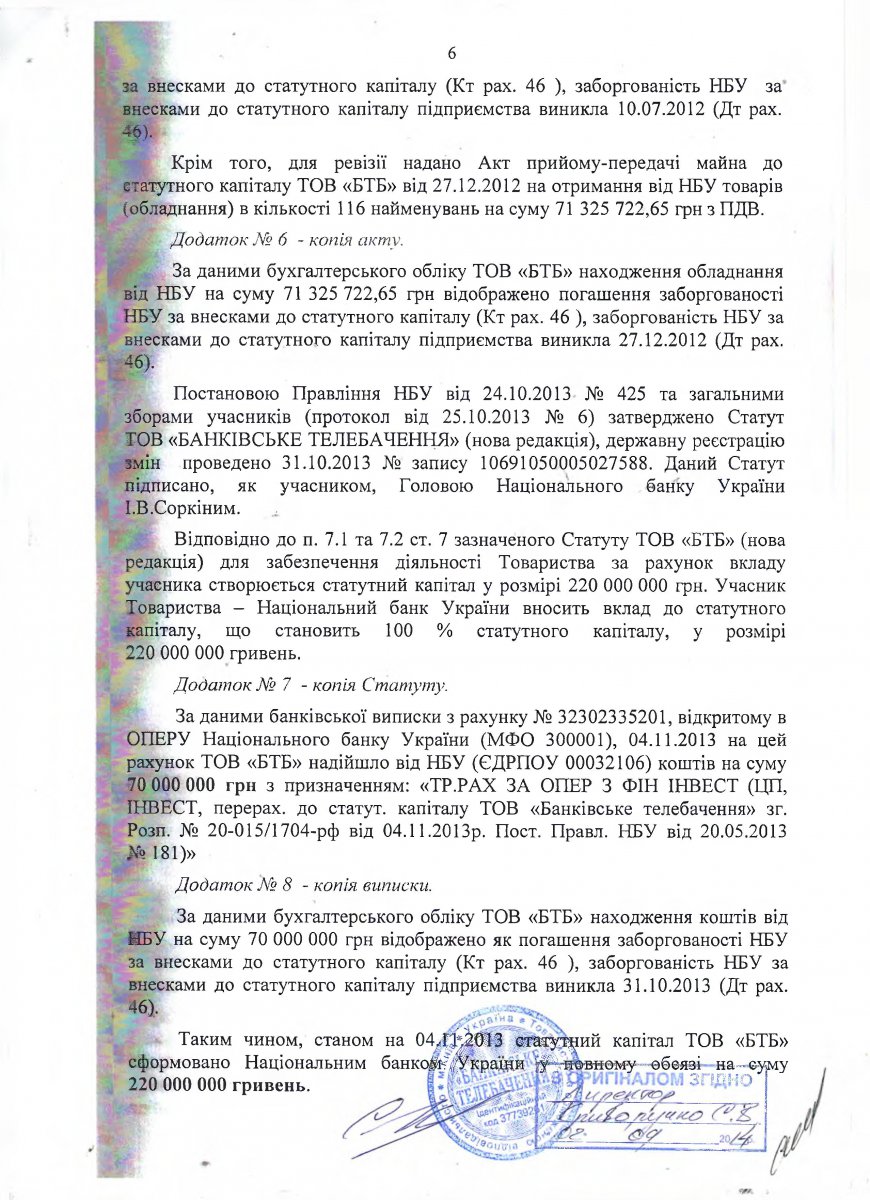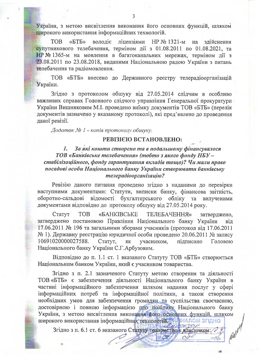"Учитывая изложенное, финансово-хозяйственная деятельность ООО "БТБ" в периоде, который ревизировался, осуществлялась за счет средств, полученных от НБУ в качестве вклада в уставный капитал и собственных доходов ООО "БТБ". Учитывая изложенное, этой ревизией нарушений требований законодательства, в том числе, которые привели к убыткам государству, при проверке данного вопроса не обнаружено ", - говорится в акте Госфининспекции.