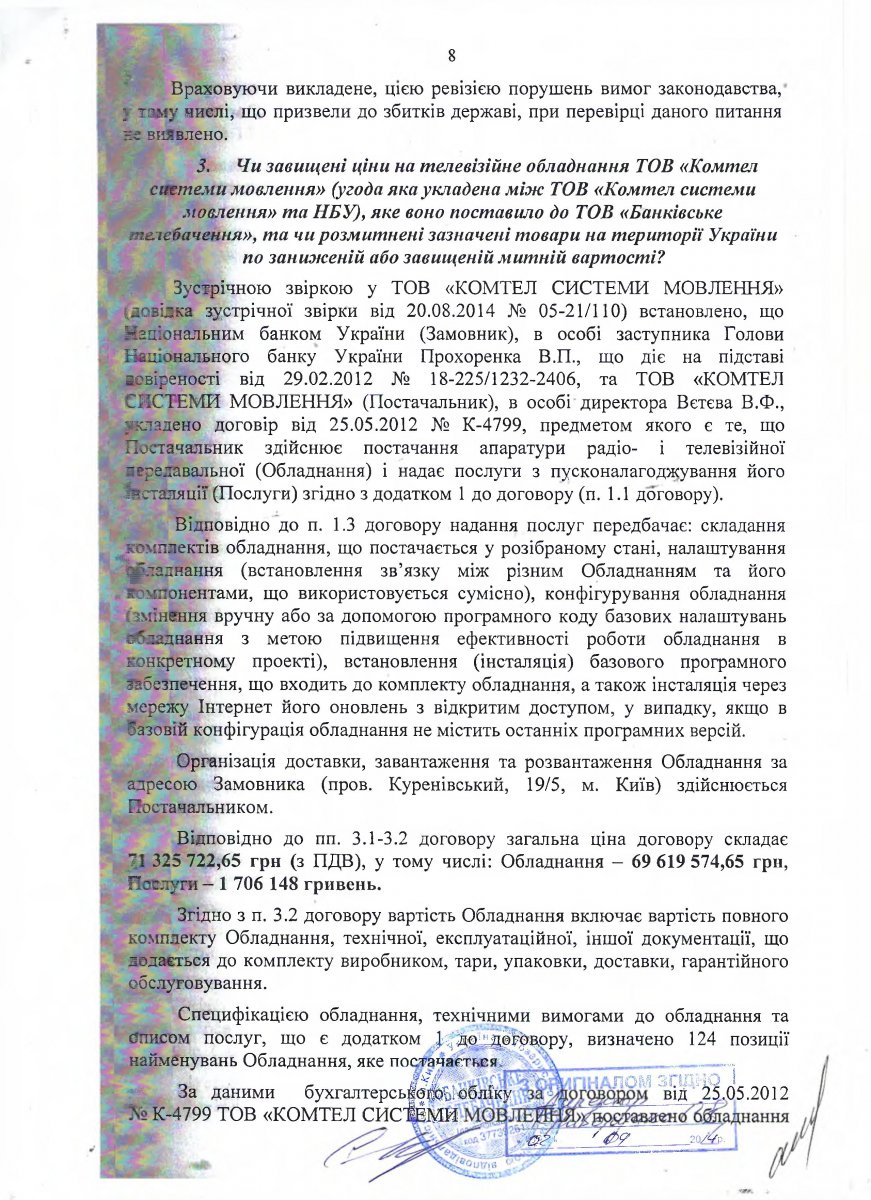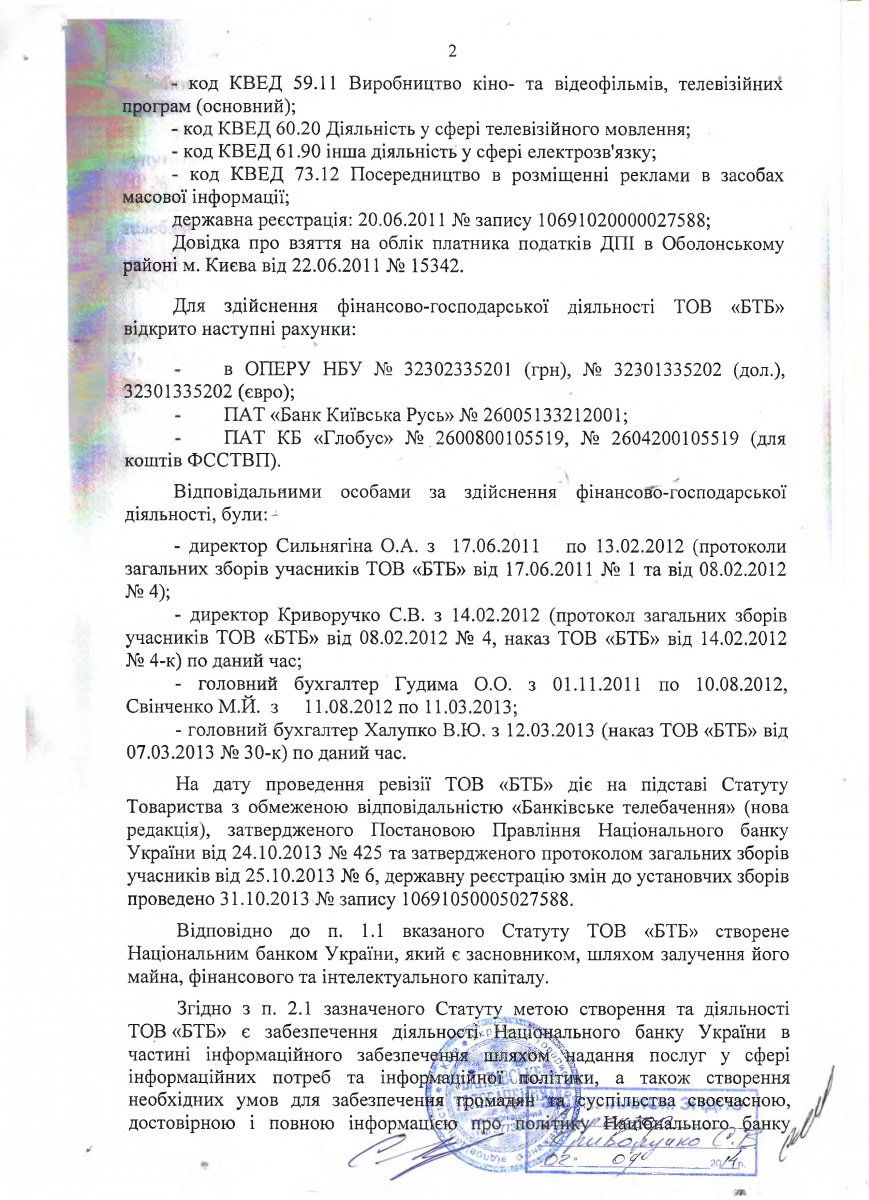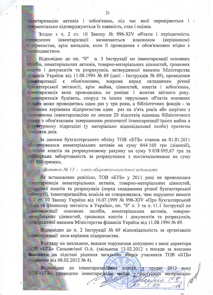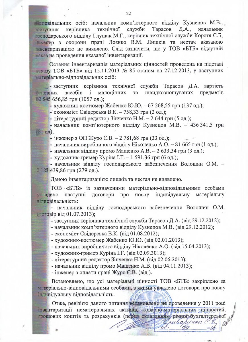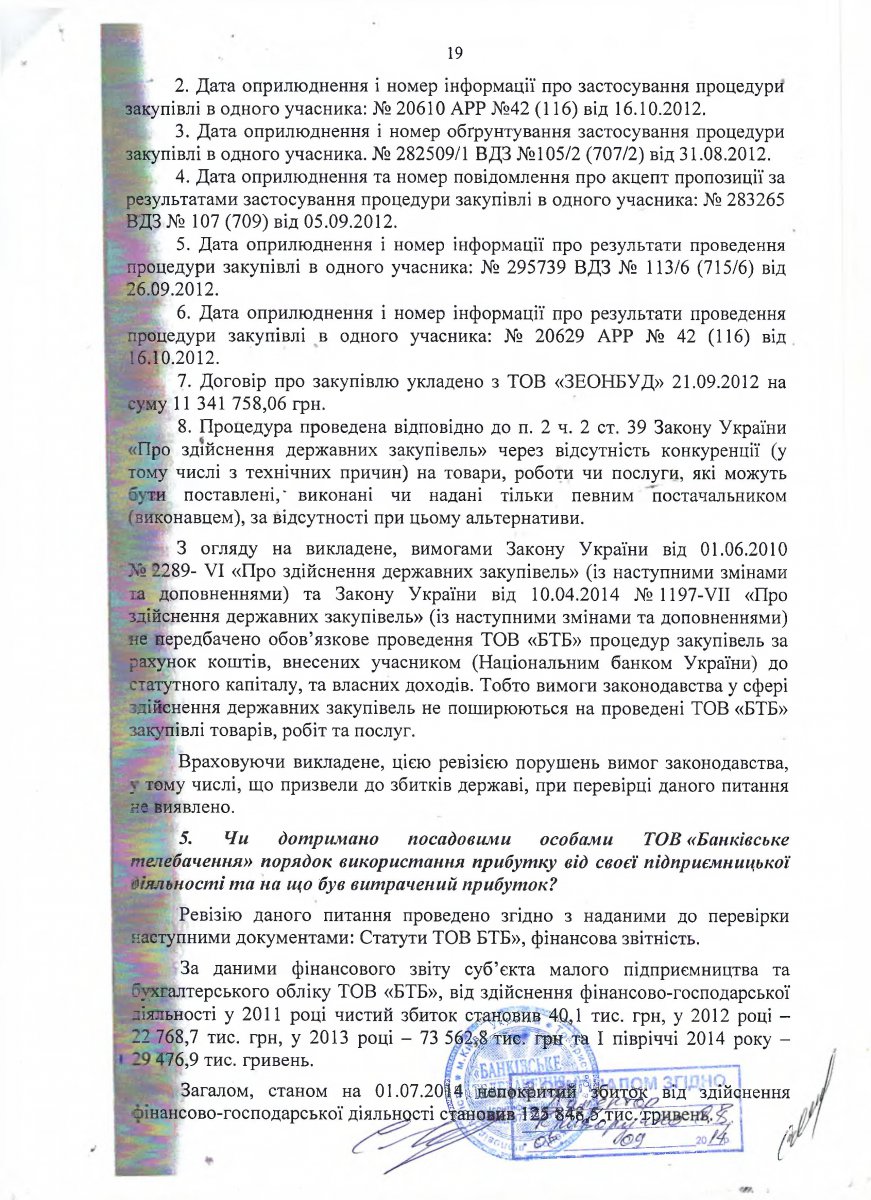 "Учитывая изложенное, финансово-хозяйственная деятельность ООО "БТБ" в периоде, который ревизировался, осуществлялась за счет средств, полученных от НБУ в качестве вклада в уставный капитал и собственных доходов ООО "БТБ". Учитывая изложенное, этой ревизией нарушений требований законодательства, в том числе, которые привели к убыткам государству, при проверке данного вопроса не обнаружено ", - говорится в акте Госфининспекции.