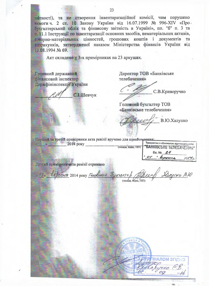 В частности, ревизия Госфининспекции проведена в соответствии с обращением Главного следственного управления ГПУ. Так, следователей ГПУ интересовал вопрос, за какие средства создана и последующем финансировалось ООО "Банковское телевидение" и имели право должностные лица Национального банка Украины создавать банковскую телерадиоорганизацию.