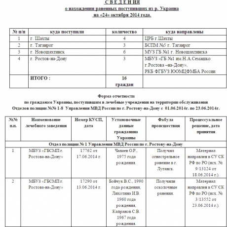 "Вот очень маленькая отчетность, которую исправно составлял начальник Дежурной части УМВД России по г. Ростову-на-Дону майор полиции М.Ю. Лобасов", - сообщила Васильева и добавила: "Если все эти граждане Украины получили огнестрельное ранение на территории своей страны - Украины - то что они делают в России, чем их вывезли в Россию и еще на каждого Следственный комитет РФ завел уголовное дело?".