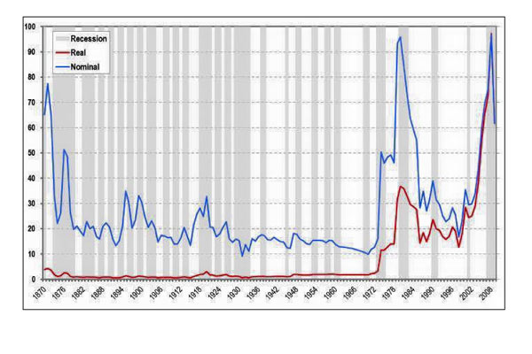 В 90-ые нефть была 15−30, а не 50 (синия линия — цена нефти в долларах 2012 года). 50 нам только снилась, как несбыточная мечта.