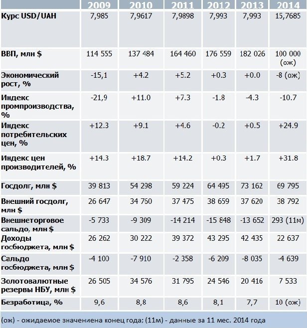 Новостная лента об экономической ситуации в стране способна вогнать в депрессию: падение ВВП на 7-8% по предварительным оценкам, инфляция на 24,9%, девальвация почти в 2 раза по официальному курсу НБУ и почти в 2,6 раза по курсу черного рынка, золотовалютные резервы НБУ за 2014 год снизились с $20,4 млрд до $7,5 млрд (а это всего лишь 50 дней импорта Украины) и т.д. Несколько особняком стоит внешнеторговый профицит на сумму 293 млн долларов за 11 месяцев 2014 года, но это вполне логичная реакция внешней торговли на девальвацию такого масштаба.