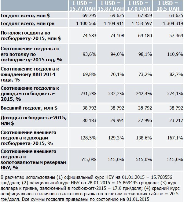 Для расчета показателей кредитоспособности государства также есть смысл обращать внимание в первую очередь на внешний прямой и гарантированный государственный долг ($38792 млн), так как Нацбанку найти, а в крайнем случае напечатать необходимые объемы гривневых ресурсов для своевременной оплаты внутреннего долга относительно легко. Если попробовать рассчитать некоторые показатели кредитоспособности (долга к доходам) с учетом разных курсов доллара к гривне, то станет понятно насколько состояние валютного рынка в данный момент является ключом к финансовой стабильности в стране.