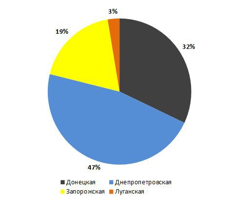 Вклад областей в общий объем выплавки стали во втором полугодии 2014 года, % (остальные области меньше 1%)