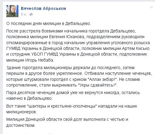 "После расстрела боевиками начальника горотдела Дебальцево, полковника милиции Евгения Юханова, подразделением руководили откомандированные в город начальник управления уголовного розыска ГУМВД Украины в Донецкой области, полковник милиции Артем Кисько и сотрудник УБОП ГУМВД Украины в Донецкой области, подполковник милиции Игорь Небаба. Здание горотдела милиционеры держали до последнего, затем перешли в другое более укрепленное. Отбивали наступление чеченцев, которые штурмовали горотдел с криком "Аллах акбар!". Не сломив сопротивление, стали выкрикивать "Укры сдавайтесь!", - написал начальник областного главка МВД у себя в Facebook.