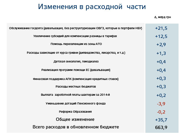 В заключение следует отметить, что это явно не последний пересмотр бюджета-2015. Во-первых, есть опасения, что экономическая ситуация будет намного хуже, чем та, на которую рассчитывали в правительстве, верстая бюджет. В заложенные макропоказатели и курс 21,7 грн за доллар не сильно верится. Во-вторых, существует вероятность, что бюджет все-таки учел не все расходы, которые в конце года вылезут боком по примеру местных бюджетов в конце 2014-го.Автор - Наталья Лещенко, экономист инициативы Ціна держави: популярна економіка