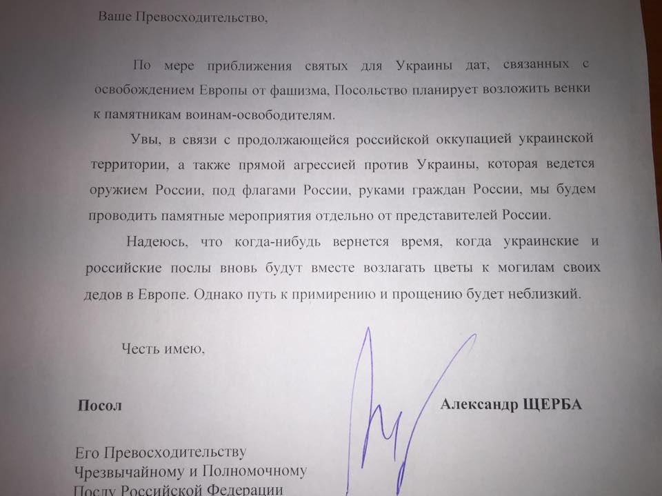 "По мере приближения святых для Украины дат, связанных с освобождением Европы от фашизма, посольство планирует возложить венки к памятникам воинам-освободителям. Увы, в связи с продолжающейся российской оккупацией украинской территории, а также прямой агрессией против Украины, которая ведется оружием России, под флагами России, руками граждан России, мы будем проводить памятные мероприятия отдельно от представителей России", - говорится в ответе Щербы на имя посла РФ в Австрии.
