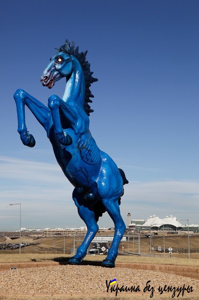 Наконец, третий тайный знак, встречающий пассажиров при подъезде к терминалу, - гигантская скульптура коня-мустанга из литого стекловолокна. Мустанги также служат достопримечательностью Колорадо, но сторонников теории заговора такое простое объяснение не устраивает. Тем более что вид этого арт-объекта даёт богатую пищу для фантазий. Бледно-голубой конь со вздутыми венами встал на дыбы, а ночью его глаза подсвечены красным светом.