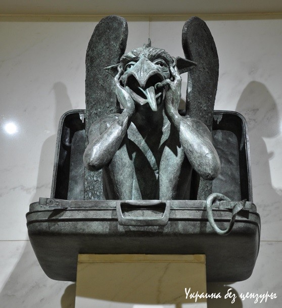 Не менее тревожные намёки любители тайн видят и в других объектах искусства, расположенных в аэропорту. Например, в скульптуре демонического существа горгульи, выглядывающей из чемодана.