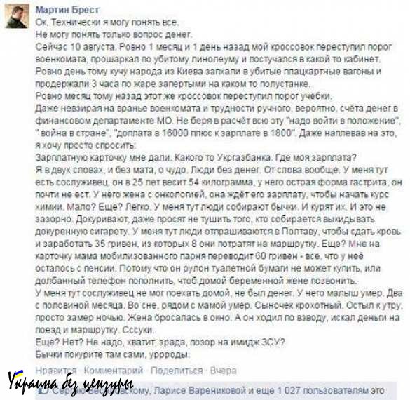 Военнослужащий ВСУ, известный в Фейсбуке под ником «Мартин Брест» рассказал в соцсети о том, как Украина финансирует «одну из сильнейших на континенте» (по словам Петра Порошенко) армию.