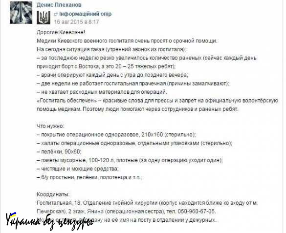 В Киевский военный госпиталь каждый день из зоны «АТО» поступает 20–25 тяжелораненых военнослужащих ВСУ, сообщают волонтеры в одном из крупнейших проукраинских пабликов Вконтакте — «Информацiйний опiр».