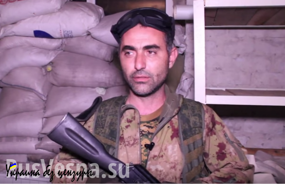 Разведчик Нохчо говорит: «Порошенко, я обычный простой человек. Я очень хочу посмотреть, как ты пройдешь по Горловке с флагом. Пока мы не можем пойти в наступление, но если враги попробуют наступать, мы ответим. Мы ждем».