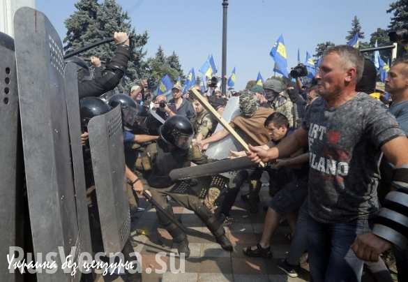 Между силовиками и митингующими произошли столкновения. Митингующие пошли штурмом на парламент и начали бросать дымовые шашки. Один из них бросил в ряды милиции и нацгвардии боевую гранату.