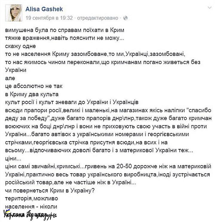 «Вынуждена была по делам поехать в Крым. Тяжёлое впечатление, даже пояснить не могу. Скажу одно. Это не население Крыма зомбировано, это мы, украинцы, зомбированы. Это нас каким-то образом убедили, что крымчанам плохо живётся без Украины. Но это совершенно не так. В Крыму два культа — культ россии и культ пренебрежения к Украине и украинцам.