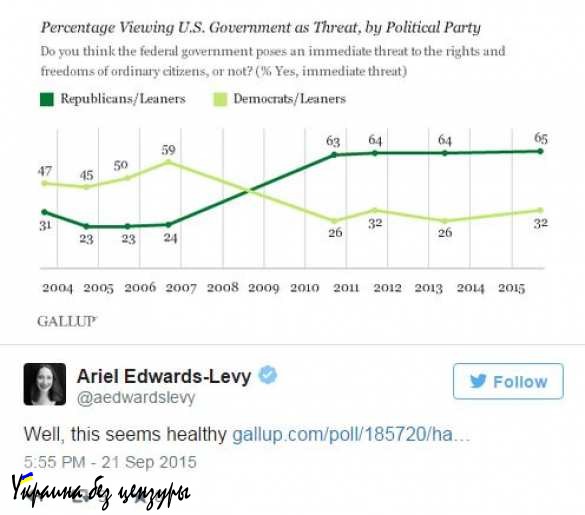 В настоящее время республиканцы вдвое сильнее не доверяют правительству, чем демократы. Десять лет назад, во времена Джорджа Буша-младшего, соотношение было прямо противоположным. По мнению исследователей из Gallup, цифры «скорее отражают отношение к президенту и несогласие с его политикой, чем глубокие чувства по отношению к правительству в целом».