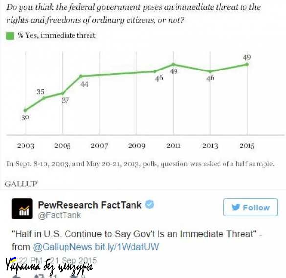 Почти половина населения США — 49% — считают, что правительство страны представляет угрозу их правам и свободам.