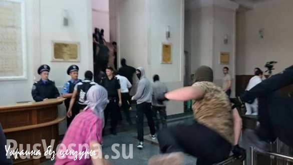 «Люди в балаклавах пытались прорваться внутрь горсовета, однако правоохранители не дали им этого сделать. В результате драки, спровоцированной „активистами“, пострадал сотрудник милиции. Его избили и на нем разорвали форму. Сейчас милиционер госпитализирован», — сообщил корреспондент одного из украинских телеканалов.